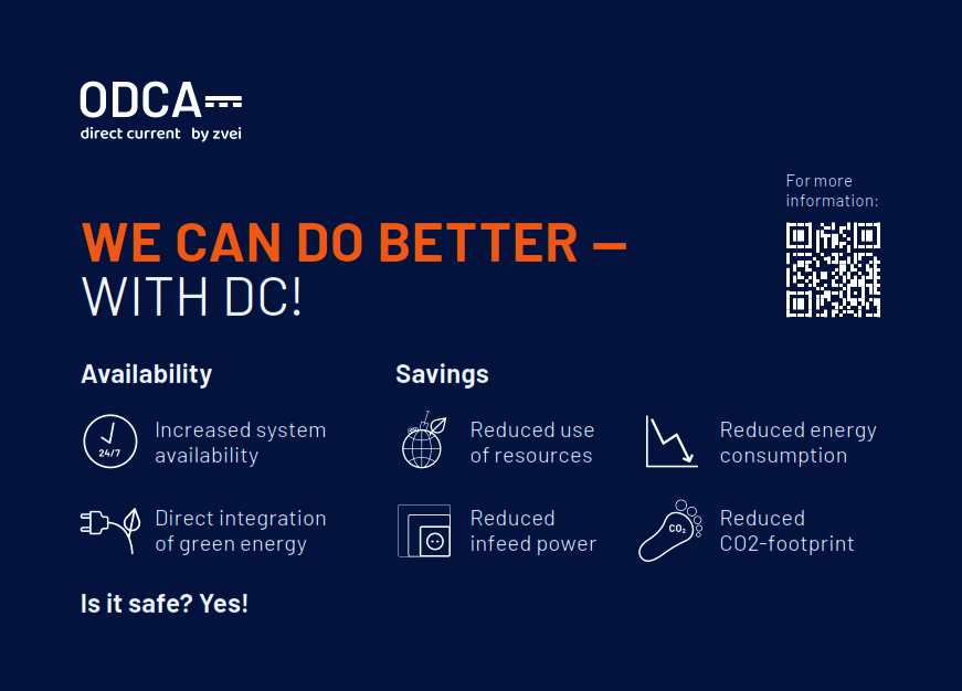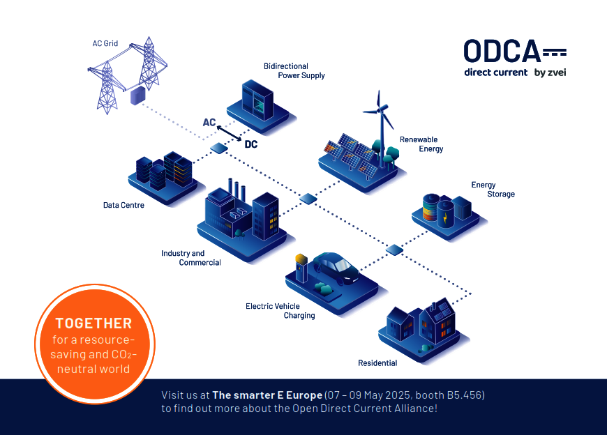 Um die Aktivitäten im Bereich Gleichstromnetze weiter voranzutreiben und zur Marktreife zu bringen, hat der ZVEI gemeinsam mit Unternehmen aus Industrie, Wissenschaft und Forschung eine international Offene Gleichstrom-Allianz gegründet. Mit dem Einsatz der Gleichstromtechnologie wird das gesellschaftliche Ziel einer ressourcenschonenden und CO2-neutralen Welt unterstützt und umgesetzt. Mittlerweile arbeiten rund 80 Mitglieder (33 zum Start 2022) in der ODCA zusammen an den gemeinsamen Zielen.