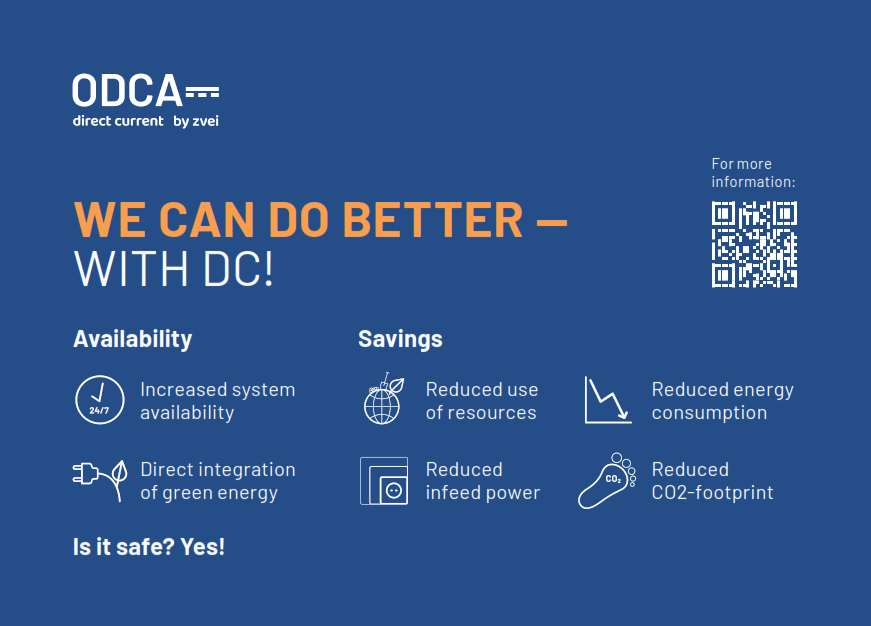 The electrical and digital industry is in a key position to achieve climate policy goals. Direct current (DC) can make a significant contribution to the success of the energy transition, as it is an effective solution for increasing energy efficiency. In order to exploit its enormous potential, knowledge about the technology and its benefits must be disseminated as widely as possible. We are now working on this together.