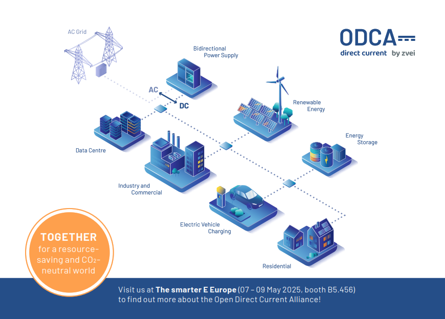 In order to further promote the activities of DC grids and to bring them to the market, ZVEI and companies from industry, academia and research founded the international Open Direct Current Alliance. The use of DC technology supports and implements the social goal of a resource-saving and CO2-neutral world. Meanwhile, around 80 members (33 at the start in 2022) are working together in the ODCA to achieve the common goals.