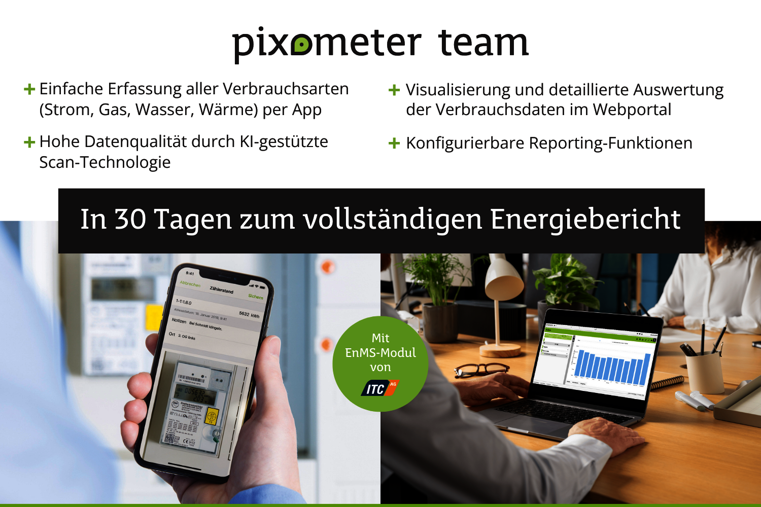 All data can be viewed immediately via a web portal and any questions can be clarified. The data can be synchronized with the corresponding energy management module pixometer EnMS (or via a Rest API to any other system). The EnMS-Module has been created in cooperation with ITC AG, experts for energy management software.