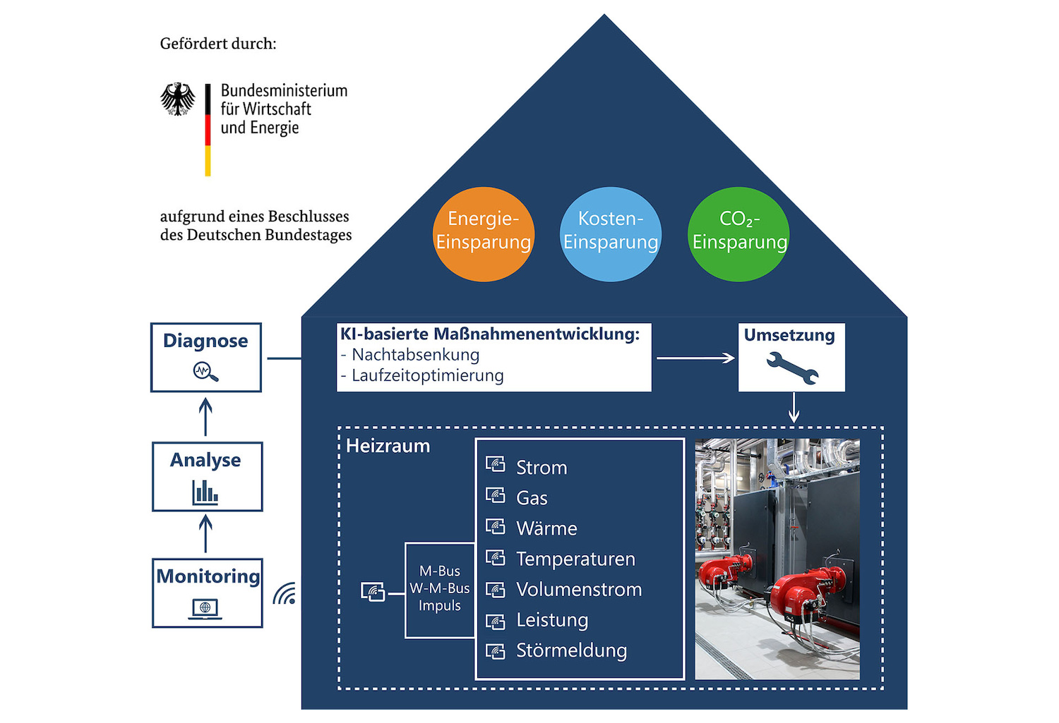Heizungen in Mehrfamilienhäusern sind oft veraltet und schlecht eingestellt. Im Rahmen des Einsparzählerprogramms digitalisiert EWUS im Auftrag von Wohnungsgenossenschaften deren Heizräume mit entsprechender Mess- und Übertragungstechnik und empfiehlt Maßnahmen, um die Energieeffizienz zu steigern. Dafür analysiert eine Software die Daten und deckt mithilfe künstlicher Intelligenz Anomalien und Effizienzpotenziale auf.