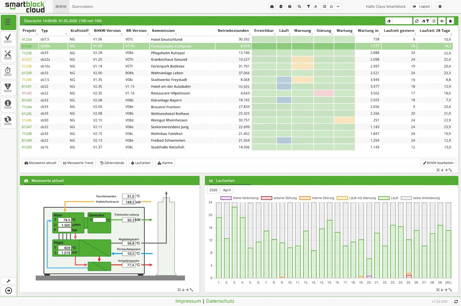 Die neue smartblock-cloud ermöglicht angemeldeten BHKW-Betreibern einen umfassenden Überblick über sämtliche Funktionen und Aktivitäten der darin erfassten Anlagen. Die Kunden können auf eine Fülle von Live-Daten zugreifen. So lassen sich aktuelle Messwerte grafisch darstellen, ebenso wie Laufzeiten, Alarmmeldungen bis hin zu aktuellen Zählerständen. Zudem bietet die Cloud eine komplette Historie aller Betriebsdaten seit Beginn der Aufzeichnung. Alle Daten können exportiert und auf einem lokalen PC ausgewertet werden.
