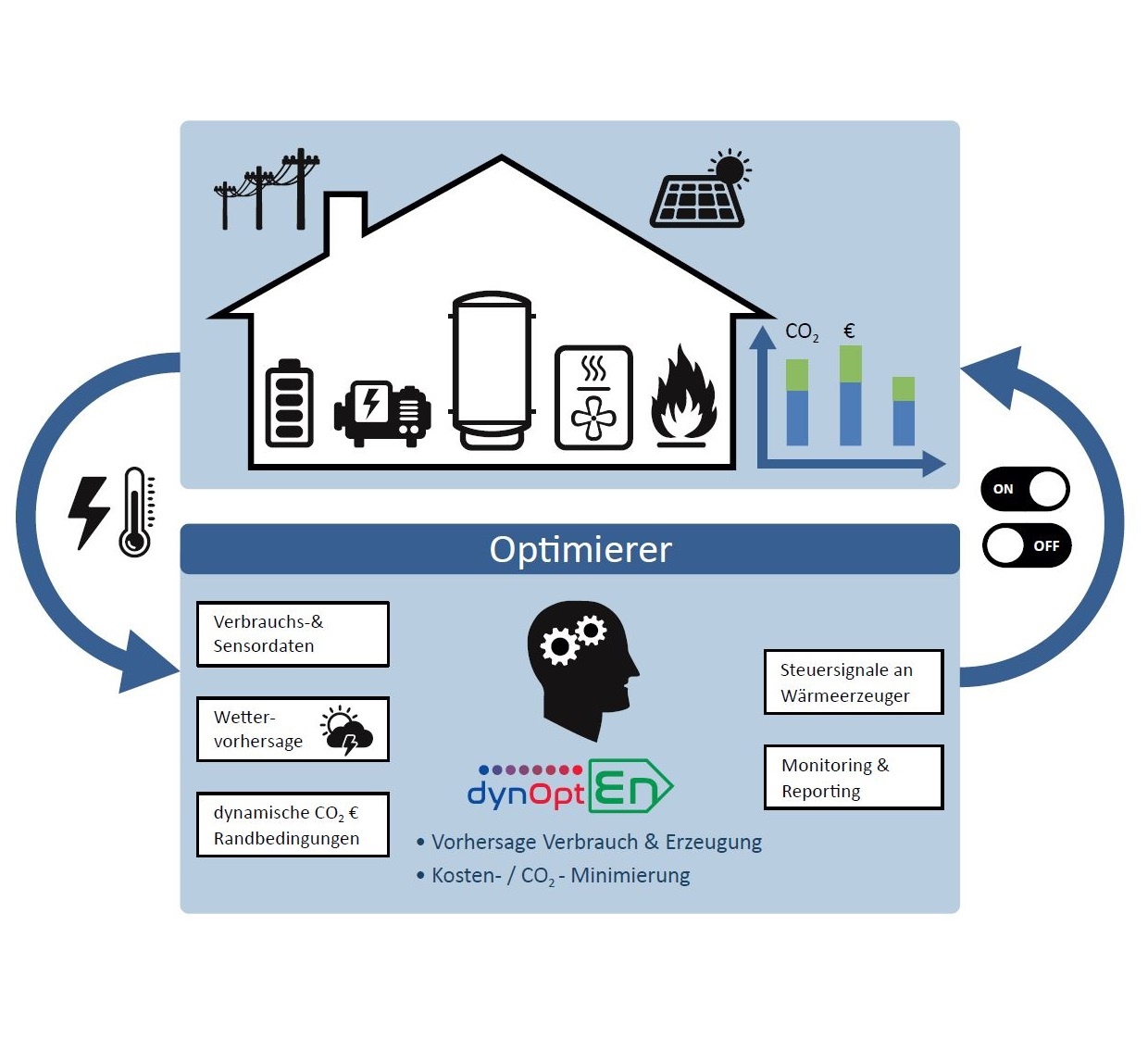 Über ein Gateway werden die Daten der für die Verbrauchsabrechnung bereits vorhanden Zähler in 15-Minuten-Auflösung an den Energiemanager übergeben. Über einen Prädiktions-Algorithmus berechnet dynOpt in Kombination mit der Wettervorhersage sowie weiteren Sensordaten, z.B. der Kesseltemperatur, fortlaufend Prognosen und steuert entsprechend die verschiedenen Energiequellen zeitlich.