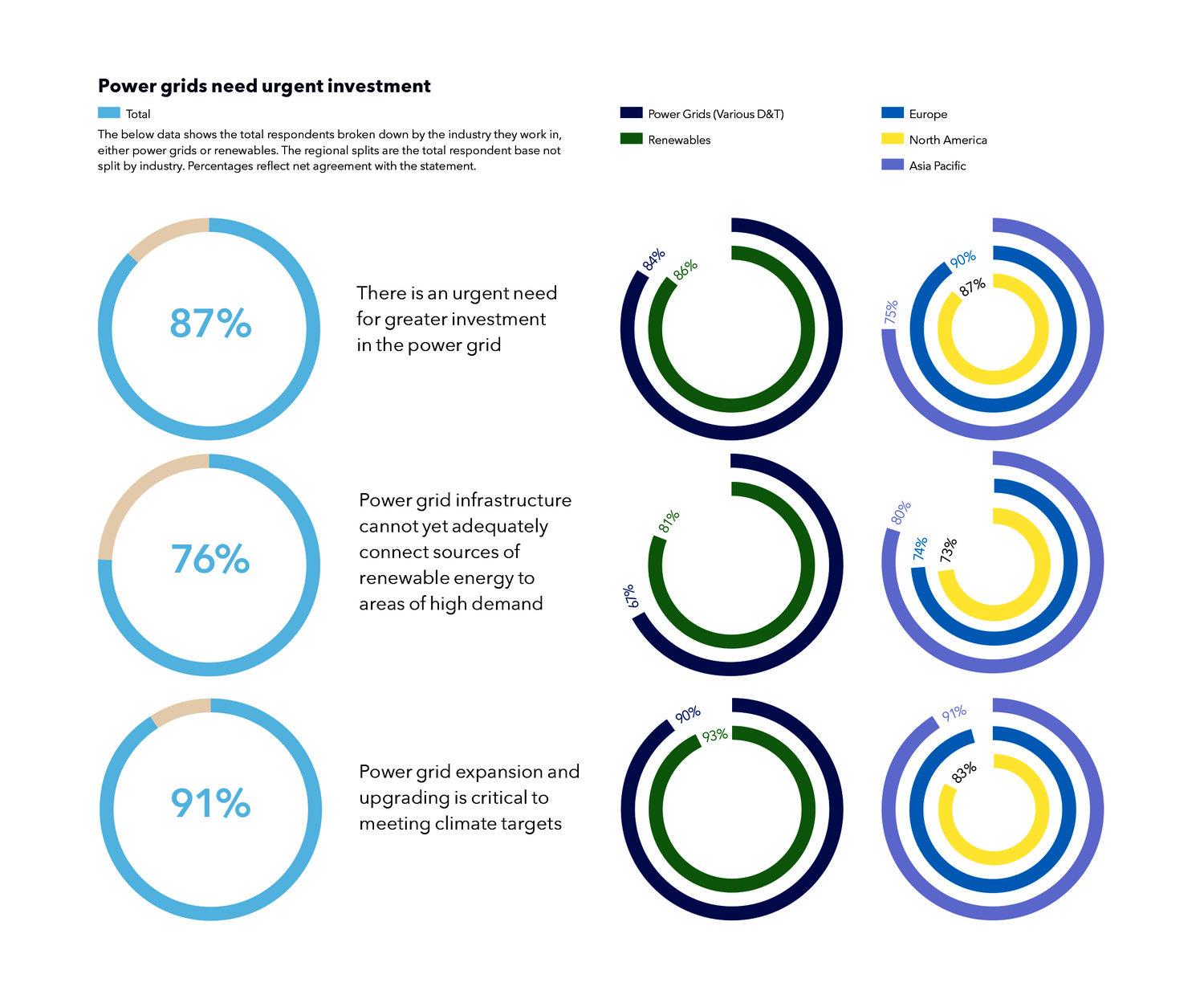 Unsere Studie zeigt, dass drei Viertel (76%) der 400 befragten leitenden Energieexperten der Meinung sind, dass die derzeitige Netzinfrastruktur nicht ausreicht, um Strom aus erneuerbaren Energien in Gebiete mit hoher Nachfrage zu leiten, und mehr als neun von zehn (91%) sagen, dass der Ausbau und die Modernisierung der Stromnetze entscheidend für die Erreichung der Klimaziele sind. Die meisten sehen im Ausbau der Netzkapazitäten die höchste Priorität für die Energiewende, insbesondere in Europa.