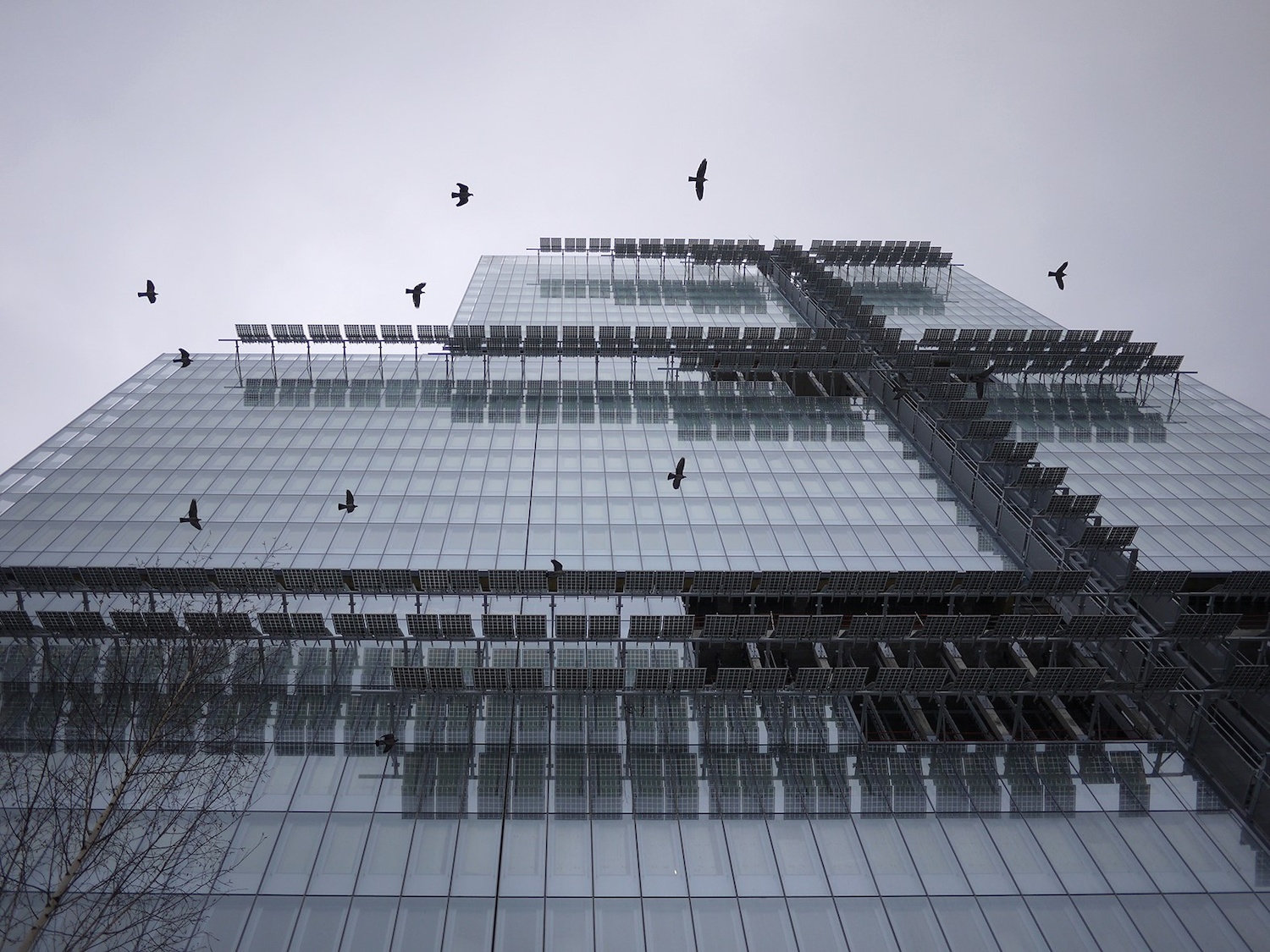On the east and west façades of the high-rise building, horizontal PV modules (271 kW) cantilever outwards on steel structures to form a continuous, narrow vertical ribbon while also flanking the three uppermost storys in each of the three building sections, which respectively step back above a projecting plinth.