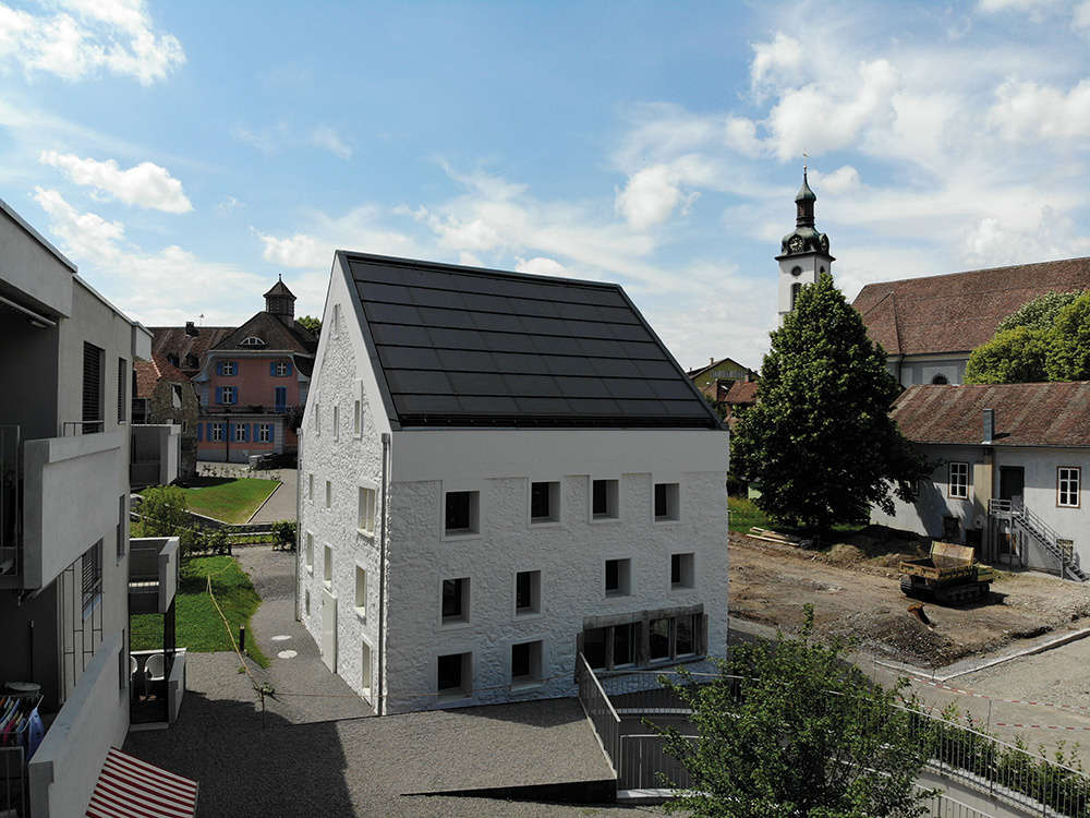 The building, whose new, striking gable roof rests on a surrounding, visible ring anchor made of concrete, is adorned on both sides by an inconspicuous solar power system. Monocrystalline PV modules (21.1 kW) in standard and special formats with a matt glass surface are elegantly installed on a special in-roof mounting system that is slightly separated from the roof verges. This is an unobtrusively sovereign solution that combines the historic building fabric with new energy technology in an exemplary manner.