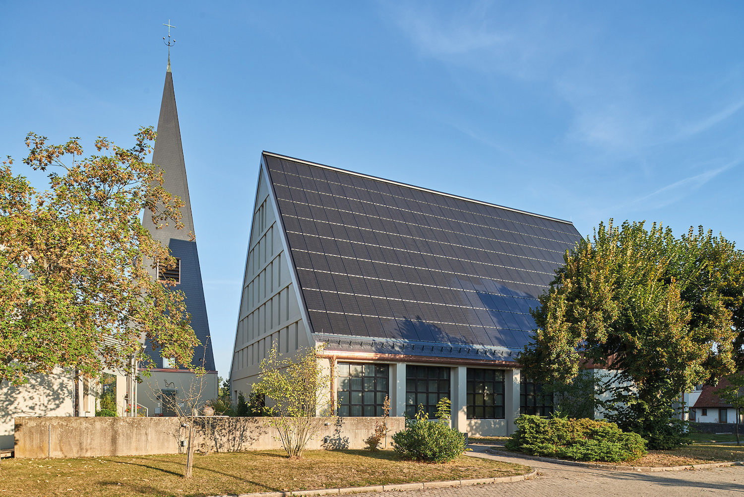 The building, completed in 1966, features a large, strikingly steep gabled roof and a free-standing bell tower with its towering, pointed tent roof. At the suggestion of the church administration, locally based architect Johannes Wunram used the repair measures as an opportunity to install a photovoltaic system on the southeast side. This has resulted in