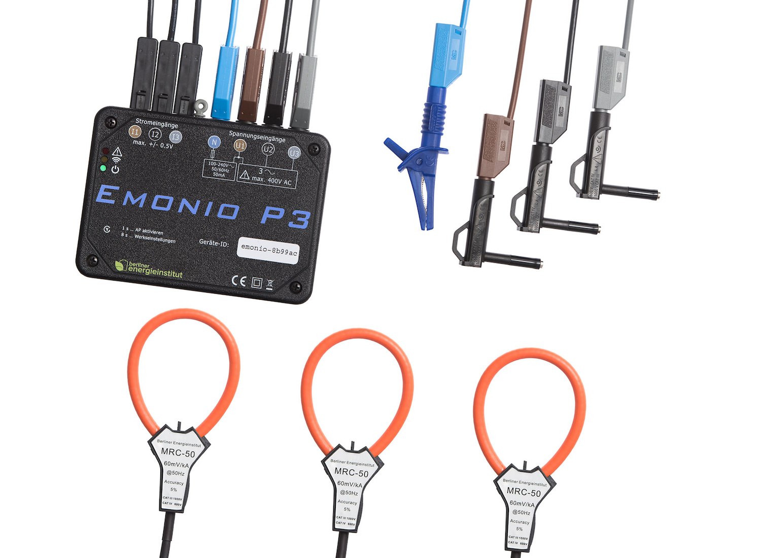 Emonio measures alternating current and voltage and uses these readings to calculate electric power and energy consumption. To measure the voltage we use various clamps for the contacts, or the magnetic tips, to reach the main contact. We use two different technologies to measure the current. The first of these is a Rogowski coil – a flexible tube that is looped around a conductor or a power cable and takes measurements using induction. The other option is a clamp-on current transformer, which is nothing more than a transformer that can be clamped into place. Although it is less expensive than a Rogowski coil, it isn’t as flexible. The clamp-on current transformer is an excellent solution for low currents but is less ideal when working with thick cables, because it’s a heavy, rigid metal instrument and it’s very difficult to position around larger cables.